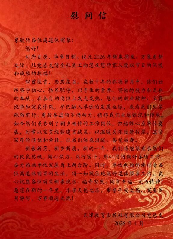 天津教育出版社有限公司党总支周密部署、精心安排,持续开展“新春慰问送关怀,岁寒情深暖人心”新时代文明实践活动。